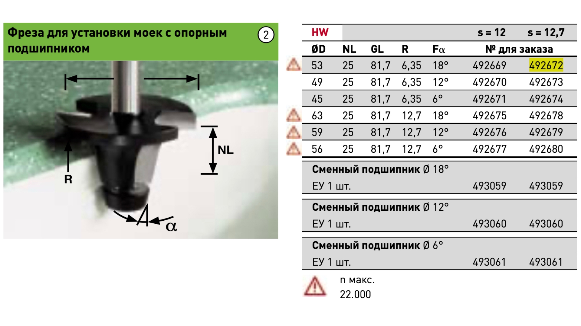 Фреза для установки моек с опорным подшипником Festool HW D 53 / NL 25 / GL 81,7 / R 6,35 492672